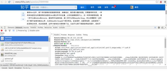 首先,打开我们的浏览器,调试浏览器F12,我用的是Chrome,打开网络监听,示意如下,比如知乎,点登录之后,我们会发现登陆之后界面都变化了,出现一个新的界面,实质上这个页面包含了许许多多的内容,这些内容也不是一次性就加载完成的,实质上是执行了好多次请求,一般是首先请求HTML文件,然后加载JS,CSS 等等,经过多次请求之后,网页的骨架和肌肉全了,整个网页的效果也就出来了。