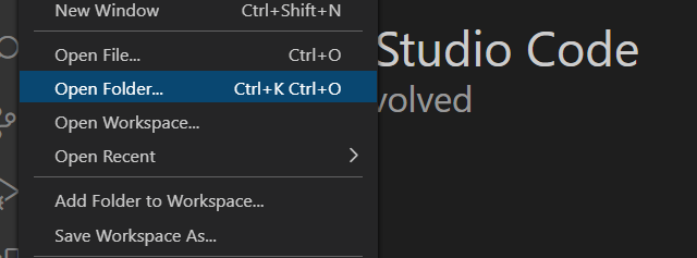 首先打开vscode开发环境,点击open Folder打开一个你要将将来写的代码文件存储在的文件夹。