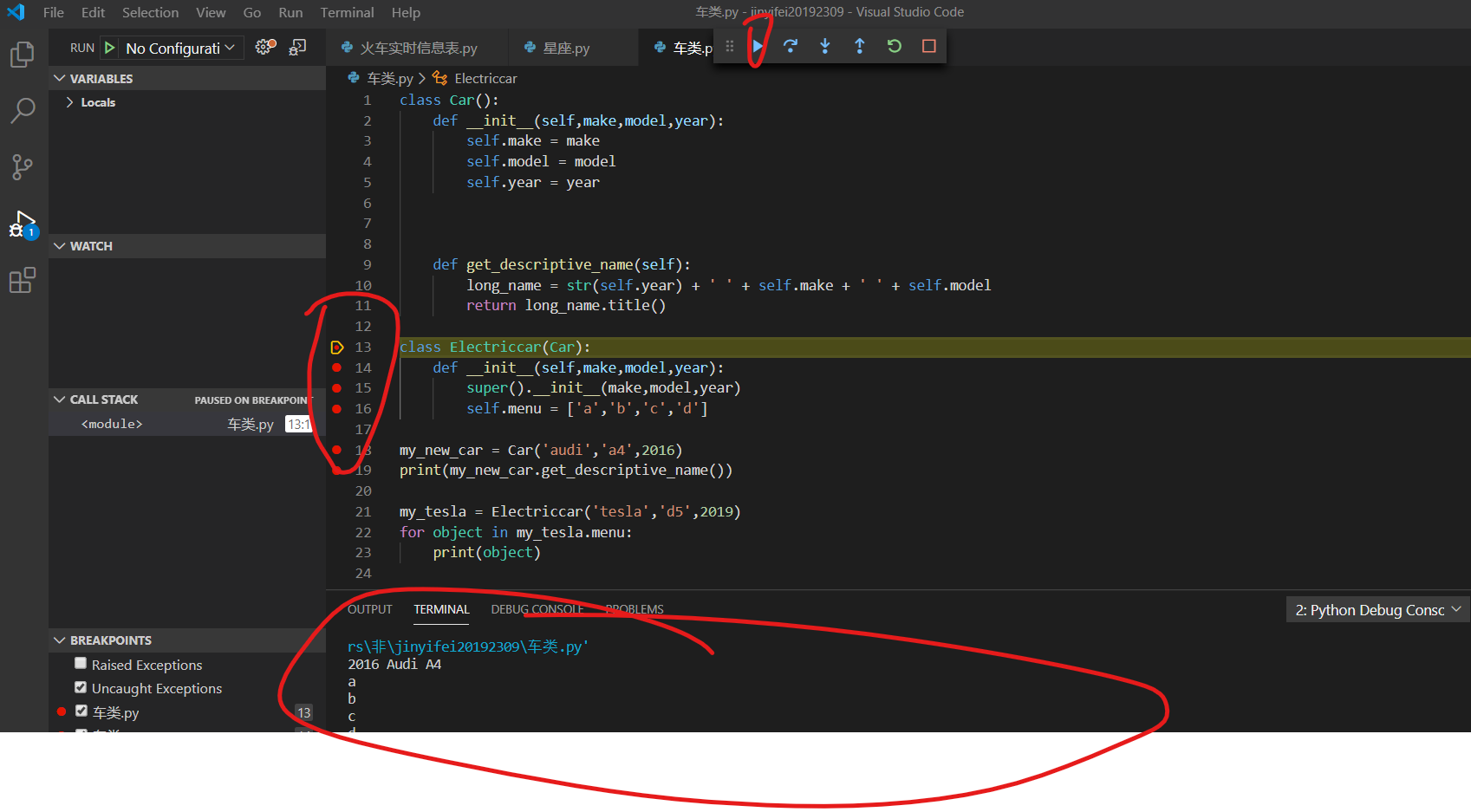 把代码左侧的圆点点红对代码添加节点,可以对代码进行部分的运行,在下面TREMINAL里可以看到部分代码的运行结果,点击上方的播放按钮可以对代码执行一句句执行的命令