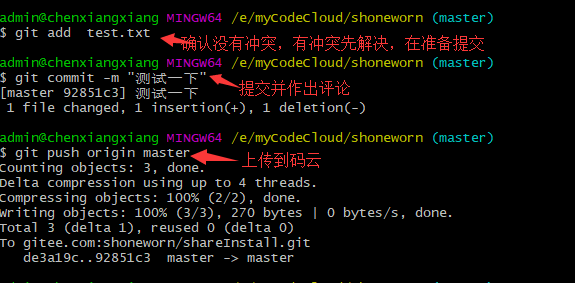 在编写完代码之后,需要将代码传到码云上此时需要先建立远程仓库,再与本地的一个文件夹进行互通,可以进行免密传送,在一切都配置完成后。用右键点击本地文件的仓库,点击 git bush here然后弹跳出命令框输入如下命令