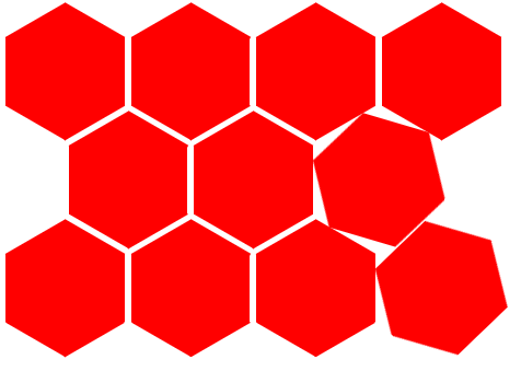 <!DOCTYPE html> <html> <head> <meta charset="utf-8"> <title>六边形</title> <style> .hexagon, .hexagon:before, .hexagon:after{ width: 87px; height: 50px; background: red; } .hexagon{ margin-top: 25px; display: inline-block; transition: transform 1s; } .hexagon:before{ content: ""; display: block; position: absolute; transform: rotate(60deg) } .hexagon:after{ content: ""; display: block; position: absolute; transform: rotate(-60deg) } .second{ margin-left: 46px; } .hexagon:hover{ transform: rotate(360deg); } </style> </head> <body> <div class="hexagon"></div> <div class="hexagon"></div> <div class="hexagon"></div> <div class="hexagon"></div> <div></div> <div class="hexagon second"></div> <div class="hexagon"></div> <div class="hexagon"></div> <div></div> <div class="hexagon"></div> <div class="hexagon"></div> <div class="hexagon"></div> <div class="hexagon"></div> </body> </html>