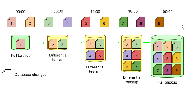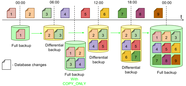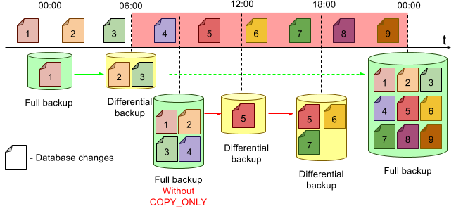 按照计划在12:00和18:00进行的后续两个差异备份完全依赖于最后一个额外的完整备份(用红色箭头标记)。