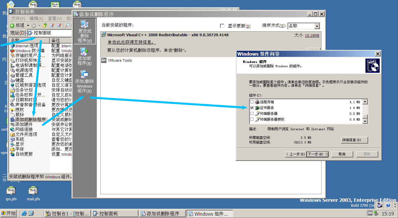 step 2) 然后安装 证书服务,它会部署一个web应用到iis中。这个过程会自动生成windows 2003服务器上的根ca证书