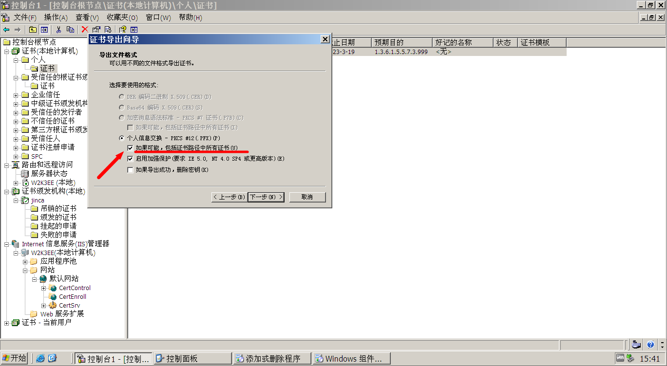 step 6)从证书颁发机构服务器上 "证书(本地计算机)"个人目录下,将证书“any”导出,注意,导出时必须选择“是,导出私钥”