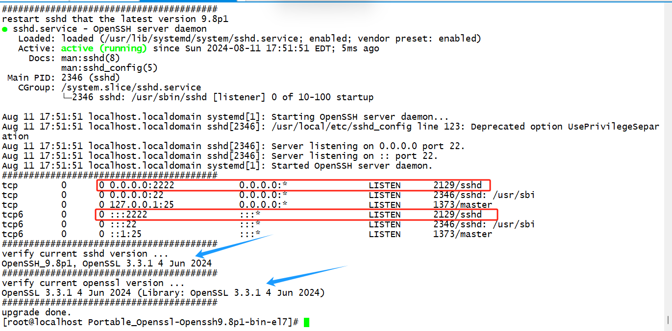 - 升级前,自动打开一个端口为2222的老版本的sshd服务,你可以连接那个2222的服务,以防死翘翘。