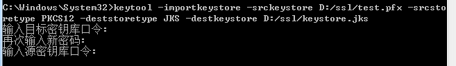 keytool -importkeystore -srckeystore D:/ssl/test.pfx -srcstoretype PKCS12 -deststoretype JKS -destkeystore D:/ssl/keystore.jks