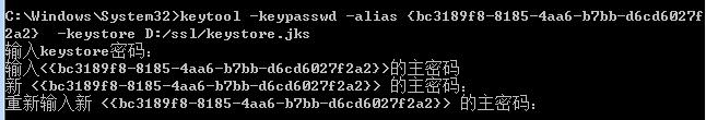 keytool -keypasswd -alias {bc3189f8-8185-4aa6-b7bb-d6cd6027f2a2} -keystore D:/ssl/keystore.jks