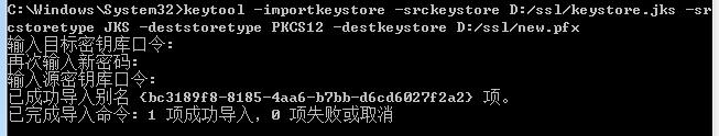 keytool -importkeystore -srckeystore D:/ssl/keystore.jks -srcstoretype JKS -deststoretype PKCS12 -destkeystore D:/ssl/new.pfx
