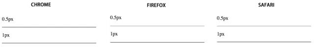 其中 Chrome 把 0.5px 四舍五入变成了 1px,而 firefox/safari 能够画出半个像素的边,并且 Chrome 会把小于 0.5px 的当成 0,而 Firefox 会把不小于 0.55px 当成 1px,Safari 是把不小于 0.75px 当成 1px,进一步在手机上观察 iOS 的 Chrome 会画出 0.5px 的边,而安卓(5.0)原生浏览器是不行的。所以直接设置 0.5px 不同浏览器的差异比较大,并且我们看到不同系统的不同浏览器对小数点的 px 有不同的处理。所以如果我们把单位设置成小数的 px 包括宽高等,其实不太可靠,因为不同浏览器表现不一样。