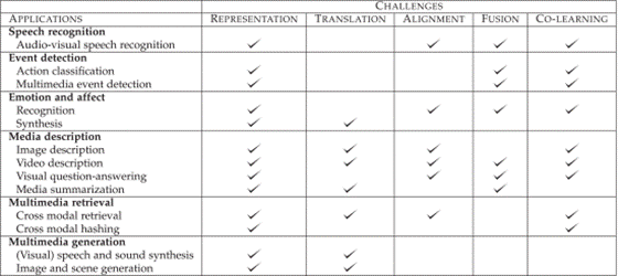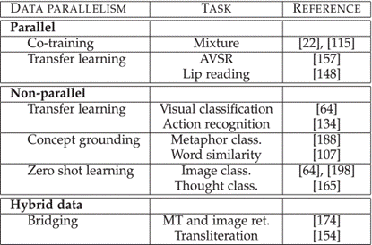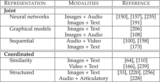 - 需要训练数据集,其中来自一种模态的观察结果与来自其他模态的观察结果直接相关;协同训练、表示学习、迁移学习