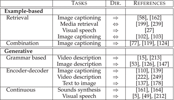 - 基于语法(grammar-based), 编码器-解码器模型(encoder-decoder), 连续生成(continuous generation)【基于源模态输入流连续生成目标模态,最适合在时间序列之间进行转换】