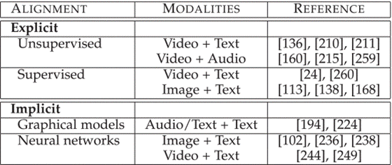 3、对齐(Alignment):从两个或多个不同的模态中识别(子)元素之间的直接关系(identify the direct relations between (sub)elements from two or more different modalities)