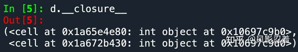 闭包的__closure__方法,可以展示出闭包储存了外部函数的两个变量,cell的内存地址是什么,在cell里面储存的对象类型是int,这个int储存的内存地址是什么。
