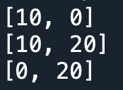它一共运行了三次,第一次是沿X轴前进了10来到[10,0],第二次是沿Y轴前进了20来到 [10, 20],,第三次是反方向沿X轴退了10来到[0, 20]。
