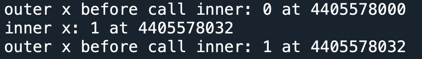 在 innerFunc 中 x 的值发生了改变,但是原因是重新创建了一个变量 x,指向了一个新的内存地址。而在 outerFunc 中 x 的值以及内存地址并未发生变化。