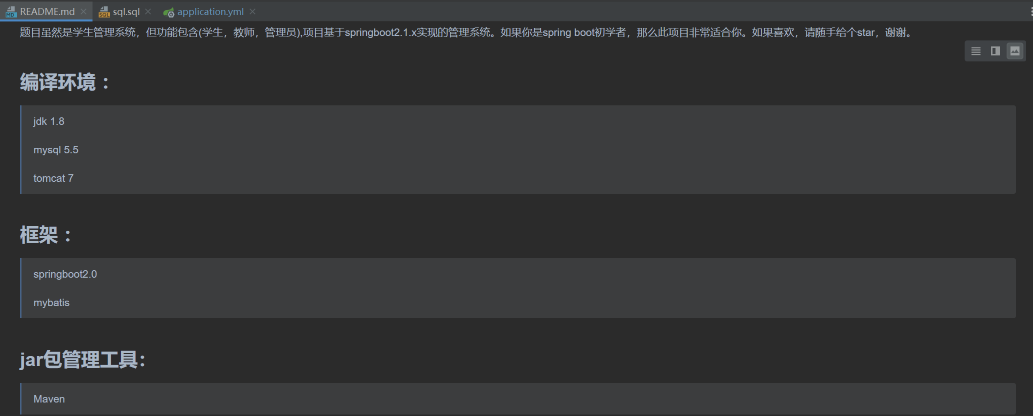 修改完毕,除此之外,我们仍需检查本地的java配置与项目是否吻合,查看readme.md文档可知,该项目的环境要求如下: