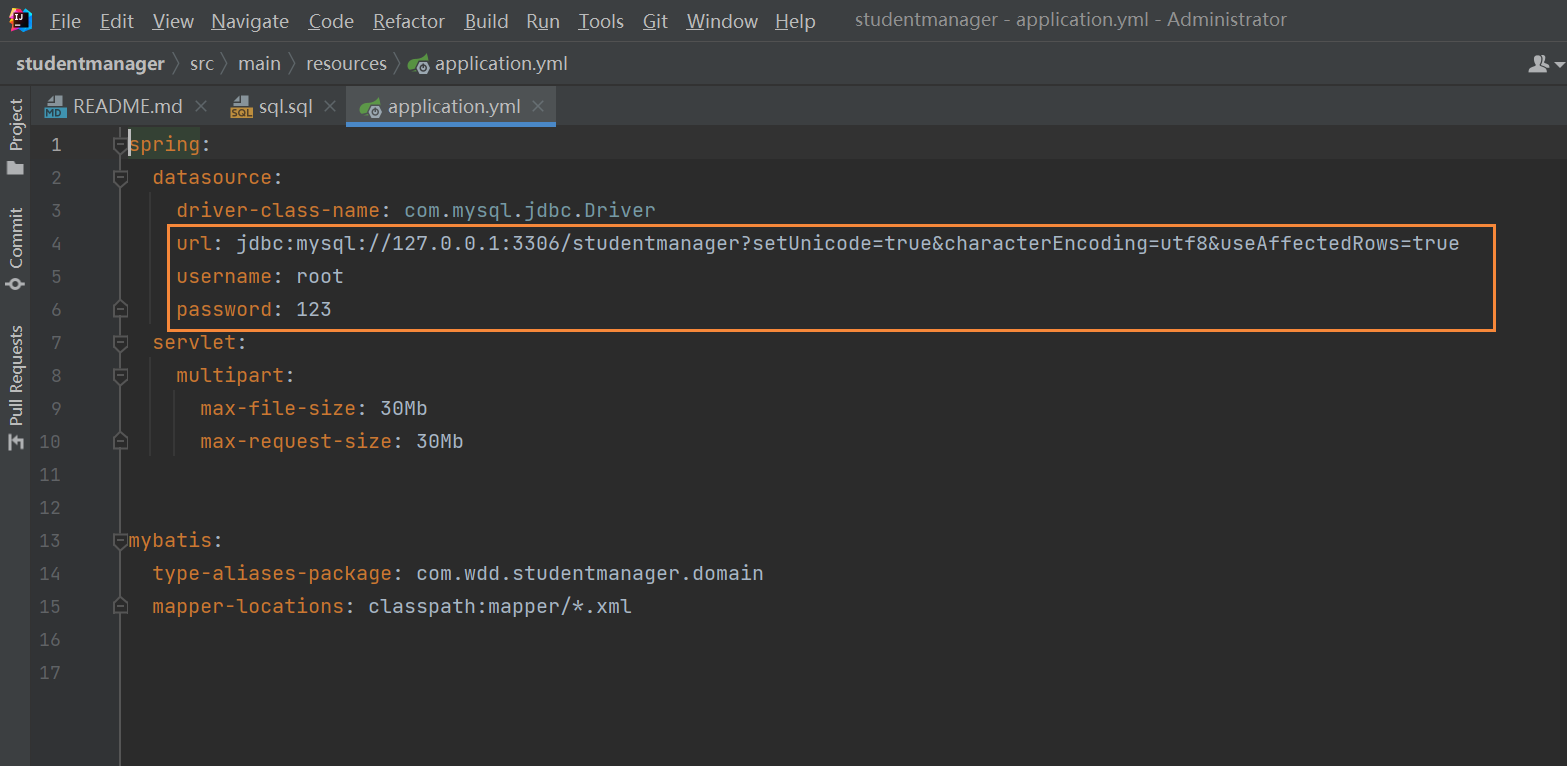 修改如下图所示的三行,url中的127.0.0.1 改为云服务器的公网ip地址,username和password改为我们先前设置的自己的数据库用户名和密码