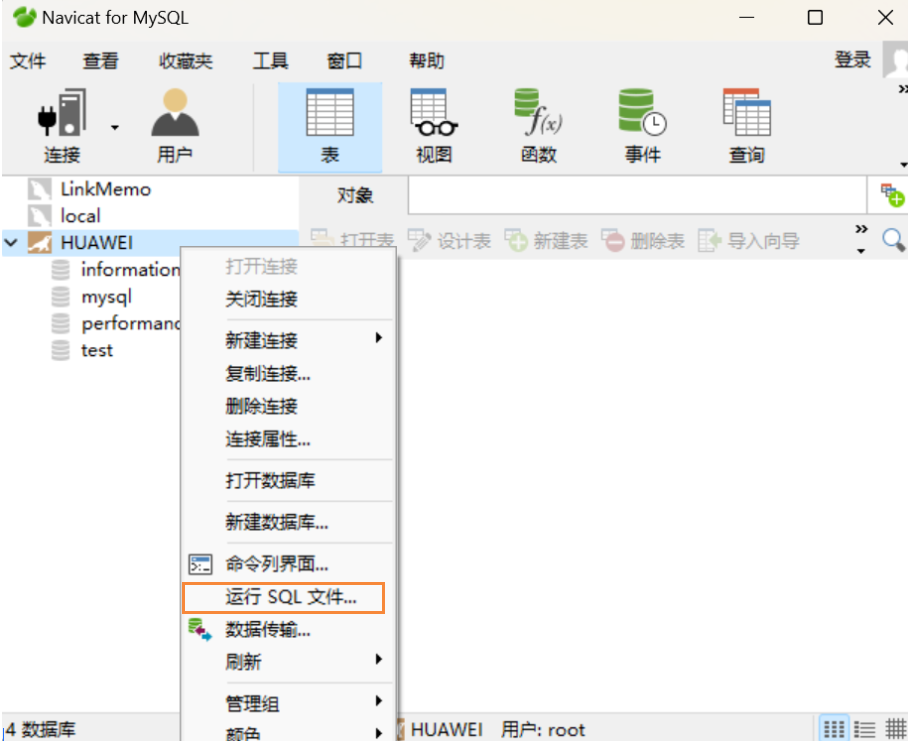 连接后可以看见云服务器上已有的数据库,在这里,我们右键链接名,运行项目源码中的SQL文件