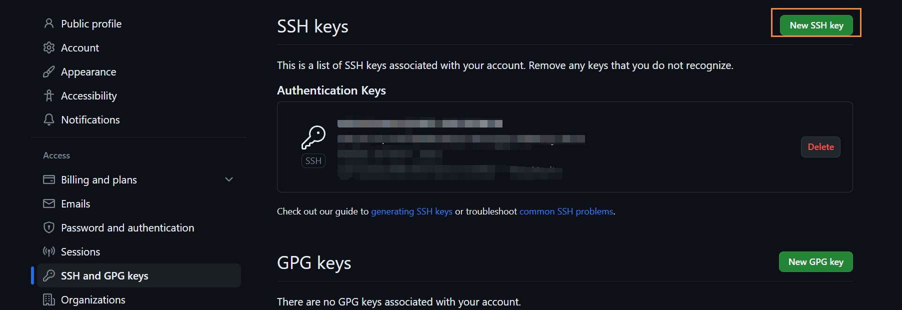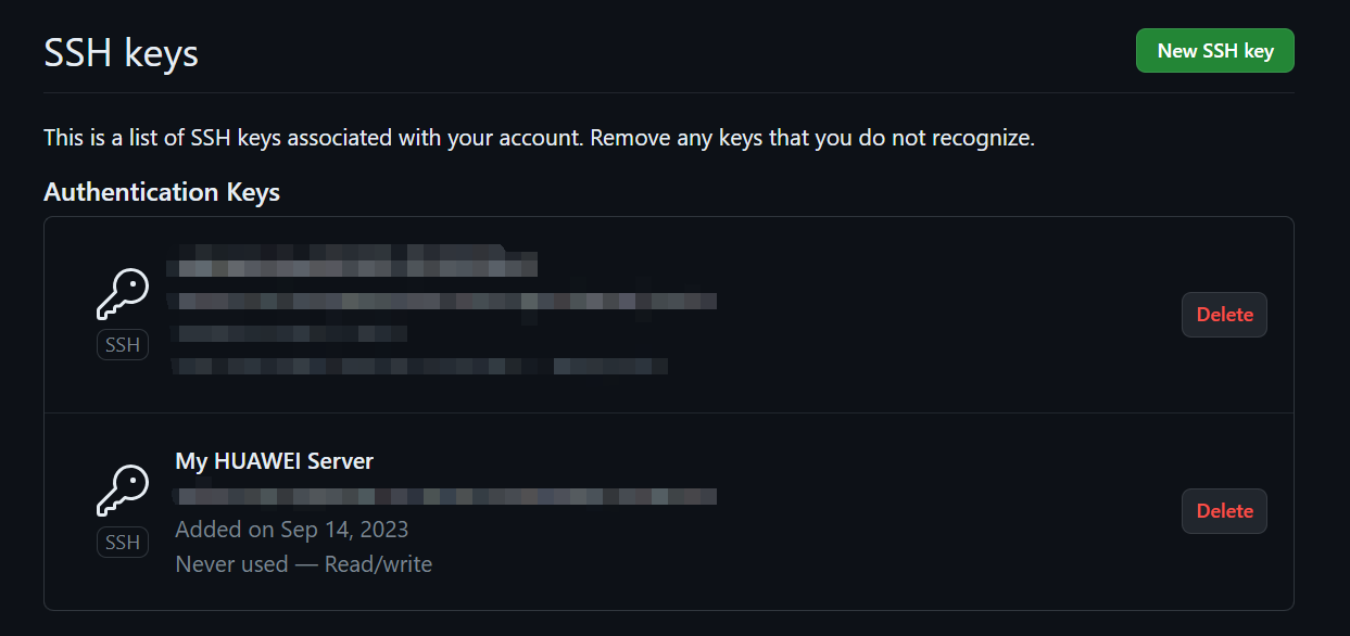 (3)点击右上角的 "New SSH key" 按钮。