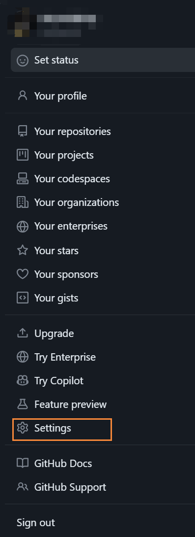 (1)打开 GitHub 账户,并点击右上角的头像选择 "Settings"。