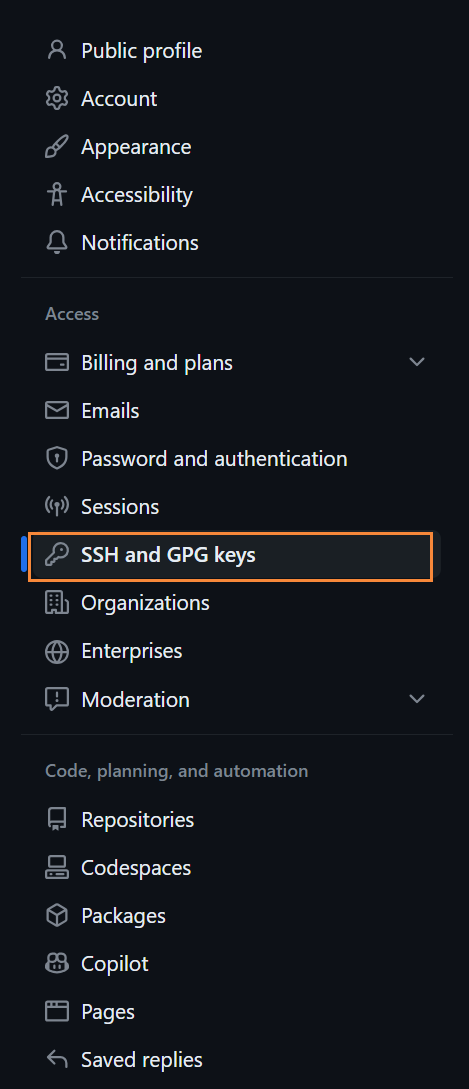 (2)在左侧菜单中,找到并点击 "SSH and GPG keys"。