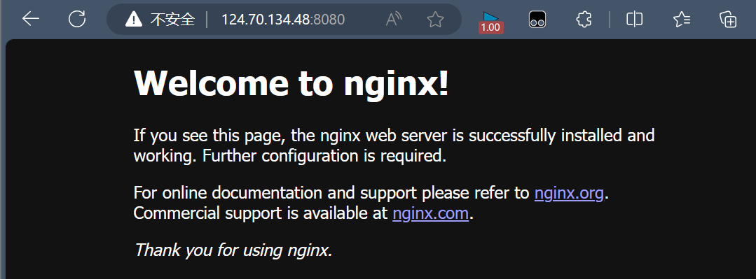 出现以上提示时,表示已经成功地运行了一个 Nginx 容器,并将容器的 80 端口映射到了主机的 8080 端口。通过访问 http://[你的服务器IP地址]:8080 来看到 Nginx 的默认欢迎页面。