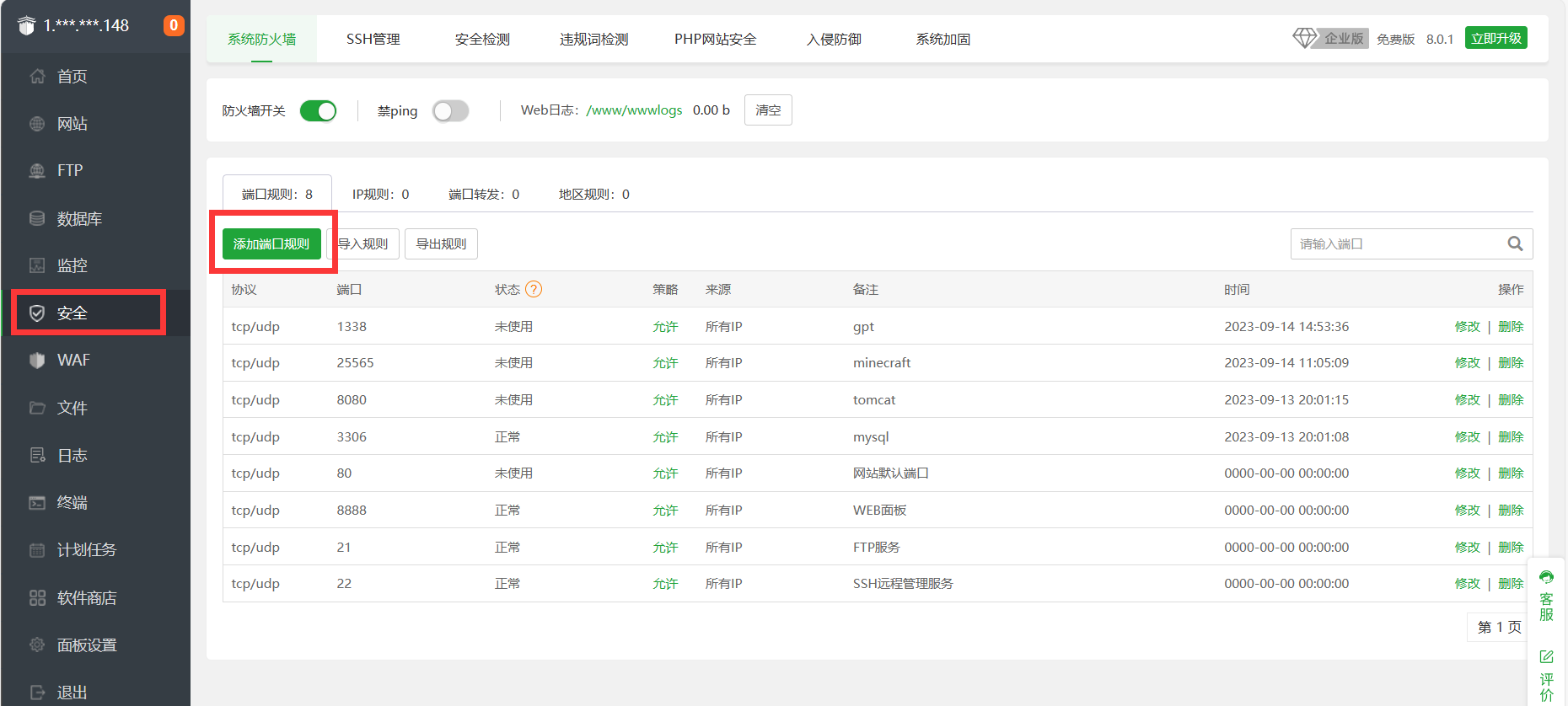 我们来到宝塔面板设置 华为云耀云服务器L实例 的相关端口,点击 安全-添加端口规则 ,如下图将5230端口添加进去。