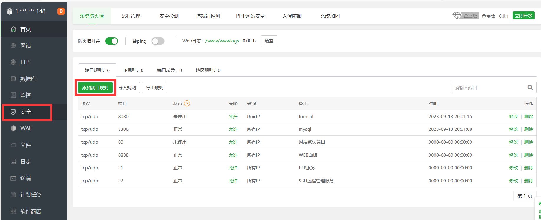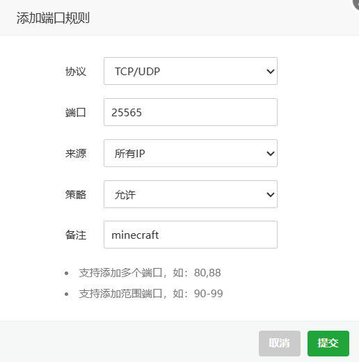 接着,我们需要在防火墙里添加刚刚的端口。我们来到宝塔管理界面,找到 安全-添加端口规则 ,将我们的25565添加进去,如下图: