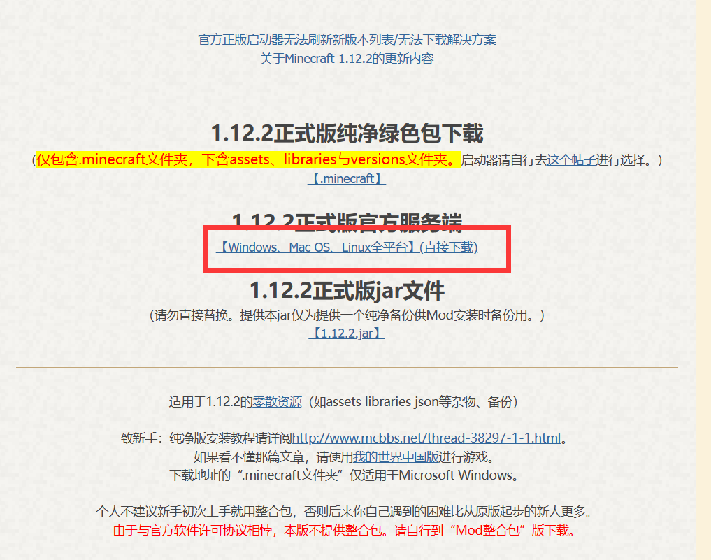 我们首先需要下载服务端jar文件,可以来到MCBBS上进行下载。在这里我们应该先明确自己游玩的minecraft版本,我这里选择的是1.12.2官方纯净版。若想游玩去其他版本,请自行利用站内搜索引擎寻找资源贴或者去其他网站寻找服务端jar文件,下载相应jar。(注意!部分整合包服务端可能不会直接提供服务端jar文件,需要自行从源码构建jar文件,届时请参照相应帖子进行构建)