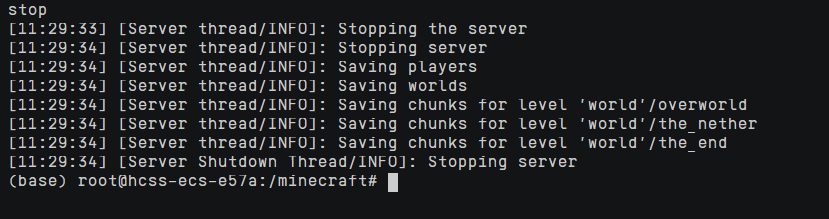 很好!我们现在已经能成功启动minecraft服务器了,如果想关闭minecraft服务器,请输入stop,如下图: