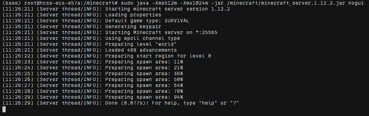 好的,那我们再次输入启动minecraft服务器的指令,看看效果: