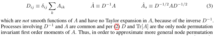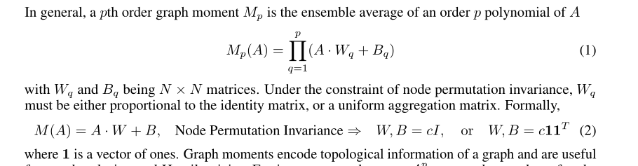 。图矩对应于特征值∧的分布,特征值∧是表征图生成过程的随机变量。图矩是节点置换不变的,这意味着节点的重新标记不会改变度的分布、给定长度的路径或三角形的数量。 - 学习图矩的问题是学习函数逼近器F,使F:A→ Mp(A),同时保持节点置换不变性。