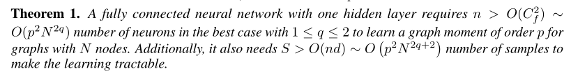 要了解图形拓扑,完全连接的层需要大量隐藏单元。以下定理用节点数N、矩阶数p和隐单元数N表征了全连通神经网络学习图矩的表示能力。