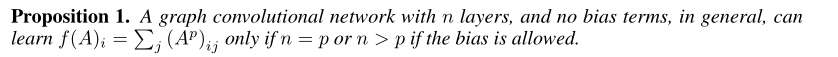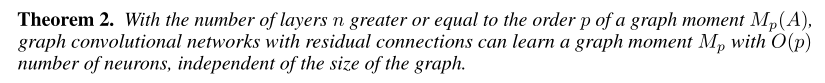 定理2表明,GCN的表示能力强烈依赖于层数(深度),而不是图的大小(宽度)。它还强调了残余连接的重要性。通过在多个GCN层中引入剩余连接,我们可以学习具有线性激活的图矩的任何多项式函数。有趣的是,在[34]中提出的图同构网络(GIN)使用了以下传播规则