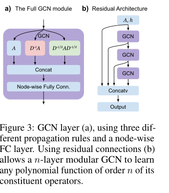 图3b)显示了带有剩余连接的多层GCN的设计。我们将模块化的GCN层堆叠在彼此的顶部,并连接来自每一层的剩余连接。最后一层聚合所有前一层的输出,包括剩余连接。