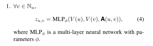 - v~\(f_{φ}(V(u), V(N_{u}), A(u))\),其中fφ(·)是根据节点u的属性、u的邻居v(Nu)的节点属性及其边属性A(u),从学习到的分布中生成一个单跳邻居v的函数。特别地,学习分布是用参数φ进行编码的.