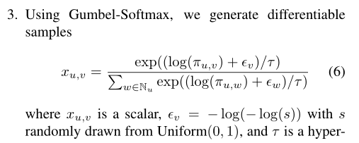 - 此外,为了使上述图的稀疏化过程可微,我们采用重参数化技巧(Jang et al., 2017)使\(Q_{φ}(g | G)\)直接生成可微样本,从而