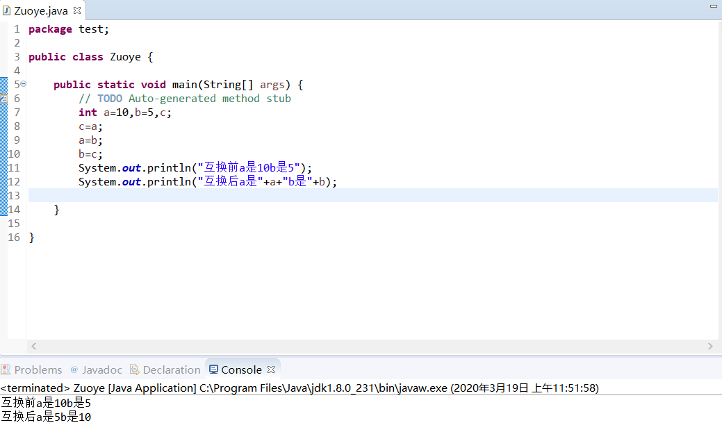 package test; public class Zuoye { public static void main(String[] args) { // TODO Auto-generated method stub int a=10,b=5,c; c=a; a=b; b=c; System.out.println("互换前a是10b是5"); System.out.println("互换后a是"+a+"b是"+b); } }