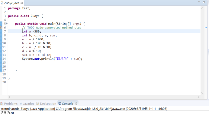 package test; public class Zuoye { public static void main(String[] args) { // TODO Auto-generated method stub int a =389; int b, c, d, e, sum; e = a / 1000; b = a / 100 % 10; c = a / 10 % 10; d = a % 10; sum = b +c +d +e; System.out.println("结果为" + sum); } }