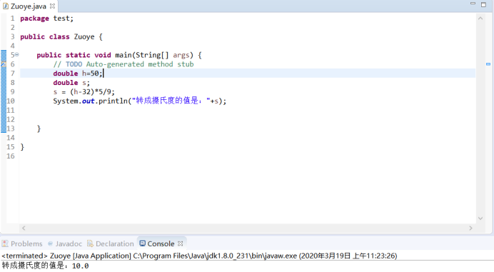 package test; public class Zuoye { public static void main(String[] args) { // TODO Auto-generated method stub double h=50; double s; s = (h-32)*5/9; System.out.println("转成摄氏度的值是:"+s); } }