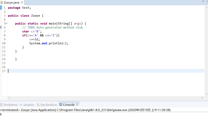 package test; public class Zuoye { public static void main(String[] args) { // TODO Auto-generated method stub char c='B'; if(c>='A' && c<='Z'){ c+=32; System.out.println(c); } } }