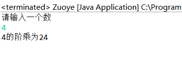package test; import java.util.Scanner; public class Zuoye { public static void main(String[] args) { Scanner input=new Scanner(System.in); System.out.println("请输入一个数"); int a=input.nextInt(); int j=1,i; for(i=1;i<=a;i++) { j*=i; } System.out.println(a+"的阶乘为"+j); } }