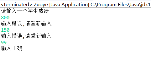 package test; import java.util.Scanner; public class Zuoye { public static void main(String[] args) { Scanner input=new Scanner(System.in); System.out.println("请输入一个学生成绩"); int a; for(a=0;;a++) { int i=input.nextInt(); if(i<0||i>100) { System.out.println("输入错误,请重新输入"); }else { System.out.println("输入正确"); break; } } } }