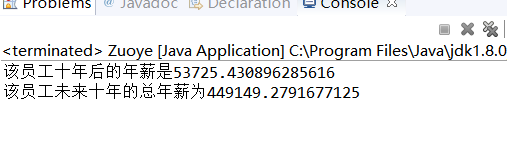 package test; public class Zuoye { public static void main(String[] args) { int i; double sum=30000,salay=30000; for(i=1;i<=10;i++) { salay+=salay*0.06; sum+=salay; } System.out.println("该员工十年后的年薪是"+salay); System.out.println("该员工未来十年的总年薪为"+sum); } }