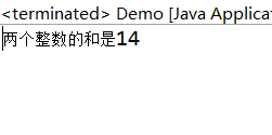 package hp; public class Demo { public static int get(int a,int b) { return a+b; } public static void main(String[] args) { // TODO Auto-generated method stub int result=Demo.get(5,9); System.out.println("两个整数的和是"+result); } }