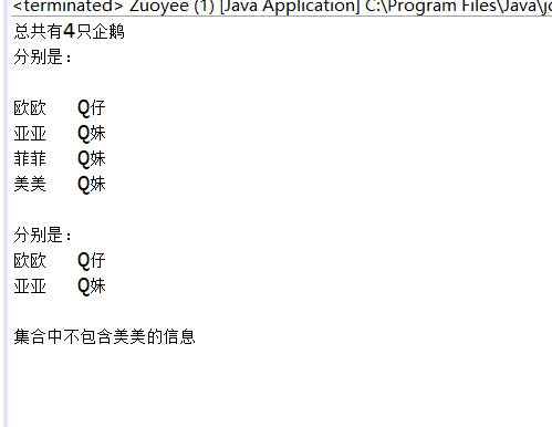 package pp; import java.util.ArrayList; public class Zuoyee { public static void main(String[] args) { // TODO Auto-generated method stub ArrayList<String> list = new ArrayList<String>(); list.add("欧欧 Q仔"); list.add("亚亚 Q妹"); list.add("菲菲 Q妹"); list.add("美美 Q妹"); System.out.println("总共有" + list.size() + "只企鹅"); System.out.println("分别是:"); System.out.println(); for (int i = 0; i < list.size(); i++) { System.out.println(list.get(i)); } list.remove(2); list.remove("美美 Q妹"); System.out.println(); System.out.println("分别是:"); for (int i = 0; i < list.size(); i++) { System.out.println(list.get(i)); } System.out.println(); if (list.contains("美美 Q妹")) { System.out.println("集合中包含美美的信息"); } else { System.out.println("集合中不包含美美的信息"); } } }