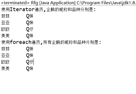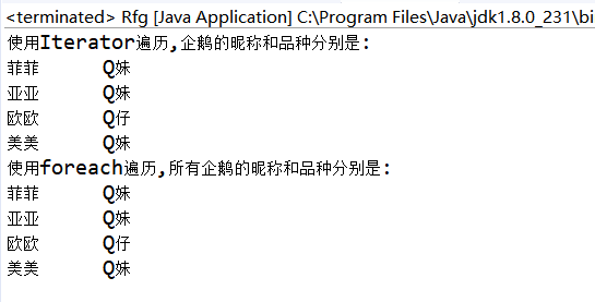 package pi; import java.util.HashMap; import java.util.Iterator; import java.util.Map; import java.util.Set; public class Rfg { public static void main(String[] args) { // TODO Auto-generated method stub Map<String,String> map=new HashMap(); map.put("欧欧","Q仔"); map.put("亚亚","Q妹"); map.put("美美","Q妹"); map.put("菲菲","Q妹"); System.out.println("使用Iterator遍历,企鹅的昵称和品种分别是:"); Set<String> keyset = map.keySet(); Iterator<String> iter = keyset.iterator(); while(iter.hasNext()){ String key=iter.next(); String value=map.get(key); System.out.println(key+"\t"+value); } System.out.println("使用foreach遍历,所有企鹅的昵称和品种分别是:"); for (String key : keyset) { String sex = map.get(key); System.out.println(key + "\t" + sex); } } }
