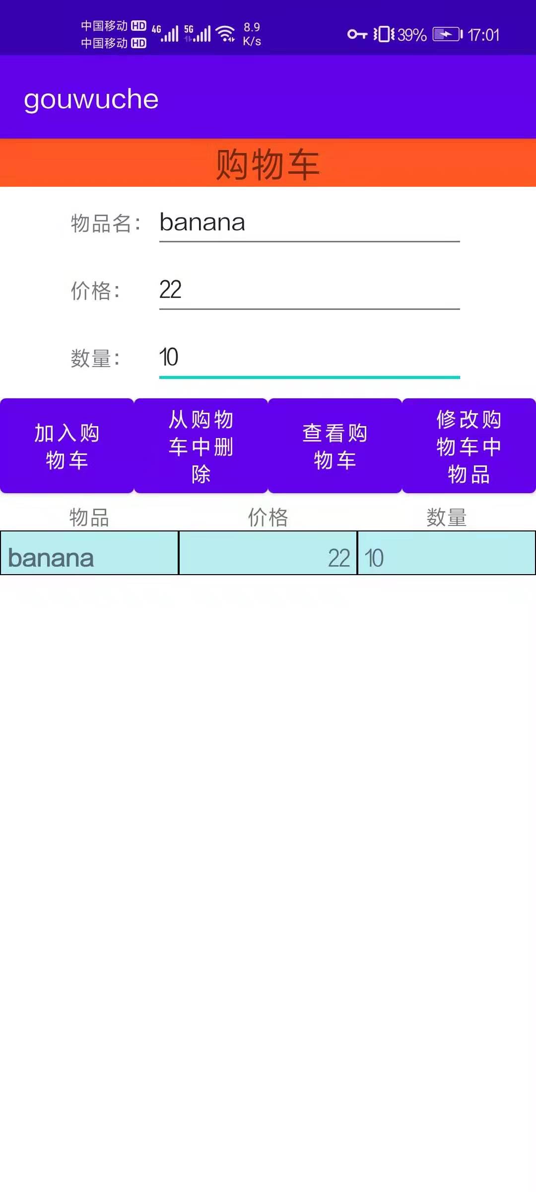 <?xml version="1.0" encoding="utf-8"?> <LinearLayout xmlns:android="http://schemas.android.com/apk/res/android" xmlns:tools="http://schemas.android.com/tools" android:layout_width="match_parent" android:layout_height="wrap_content" android:orientation="vertical" tools:context=".MainActivity"> <TextView android:id="@+id/textView" android:layout_width="match_parent" android:layout_height="wrap_content" android:background="#FF5722" android:gravity="center_horizontal" android:text="购物车" android:textSize="24sp" /> <TableLayout android:layout_width="match_parent" android:layout_height="match_parent"> <TableRow android:layout_width="match_parent" android:layout_height="match_parent" android:gravity="center_horizontal"> <TextView android:id="@+id/textView2" android:layout_width="wrap_content" android:layout_height="wrap_content" android:text="物品名:" /> <EditText android:id="@+id/et_1" android:layout_width="wrap_content" android:layout_height="wrap_content" android:ems="10" android:inputType="textPersonName" /> </TableRow> <TableRow android:layout_width="match_parent" android:layout_height="match_parent" android:gravity="center_horizontal"> <TextView android:id="@+id/textView4" android:layout_width="wrap_content" android:layout_height="wrap_content" android:text="价格:" /> <EditText android:id="@+id/et_2" android:layout_width="match_parent" android:layout_height="wrap_content" android:ems="10" android:inputType="textPersonName" /> </TableRow> <TableRow android:layout_width="match_parent" android:layout_height="match_parent" android:gravity="center_horizontal"> <TextView android:id="@+id/textView5" android:layout_width="wrap_content" android:layout_height="wrap_content" android:text="数量:" /> <EditText android:id="@+id/et_3" android:layout_width="wrap_content" android:layout_height="wrap_content" android:ems="10" android:inputType="textPersonName" /> </TableRow> </TableLayout> <LinearLayout android:layout_width="match_parent" android:layout_height="match_parent" android:orientation="horizontal"> <Button android:id="@+id/add" android:layout_width="match_parent" android:layout_height="match_parent" android:layout_weight="1" android:onClick="add_Click" android:text="加入购物车" /> <Button android:id="@+id/delete" android:layout_width="match_parent" android:layout_height="match_parent" android:layout_weight="1" android:onClick="delete_Click" android:text="从购物车中删除" /> <Button android:id="@+id/query" android:layout_width="match_parent" android:layout_height="match_parent" android:layout_weight="1" android:onClick="find_Click" android:text="查看购物车" /> <Button android:id="@+id/update" android:layout_width="match_parent" android:layout_height="match_parent" android:layout_weight="1" android:onClick="update_Click" android:text="修改购物车中物品" /> </LinearLayout> <LinearLayout android:layout_width="match_parent" android:layout_height="match_parent" android:orientation="horizontal"> <TextView android:id="@+id/textView3" android:layout_width="40dp" android:layout_height="wrap_content" android:layout_weight="1" android:gravity="center_horizontal" android:text="物品" /> <TextView android:id="@+id/textView6" android:layout_width="40dp" android:layout_height="wrap_content" android:layout_weight="1" android:gravity="center_horizontal" android:text="价格" /> <TextView android:id="@+id/textView7" android:layout_width="40dp" android:layout_height="wrap_content" android:layout_weight="1" android:gravity="center_horizontal" android:text="数量" /> </LinearLayout> <LinearLayout android:layout_width="match_parent" android:layout_height="match_parent" android:orientation="vertical"> <ListView android:id="@+id/list" android:layout_width="match_parent" android:layout_height="match_parent" android:layout_weight="1" /> </LinearLayout> </LinearLayout>