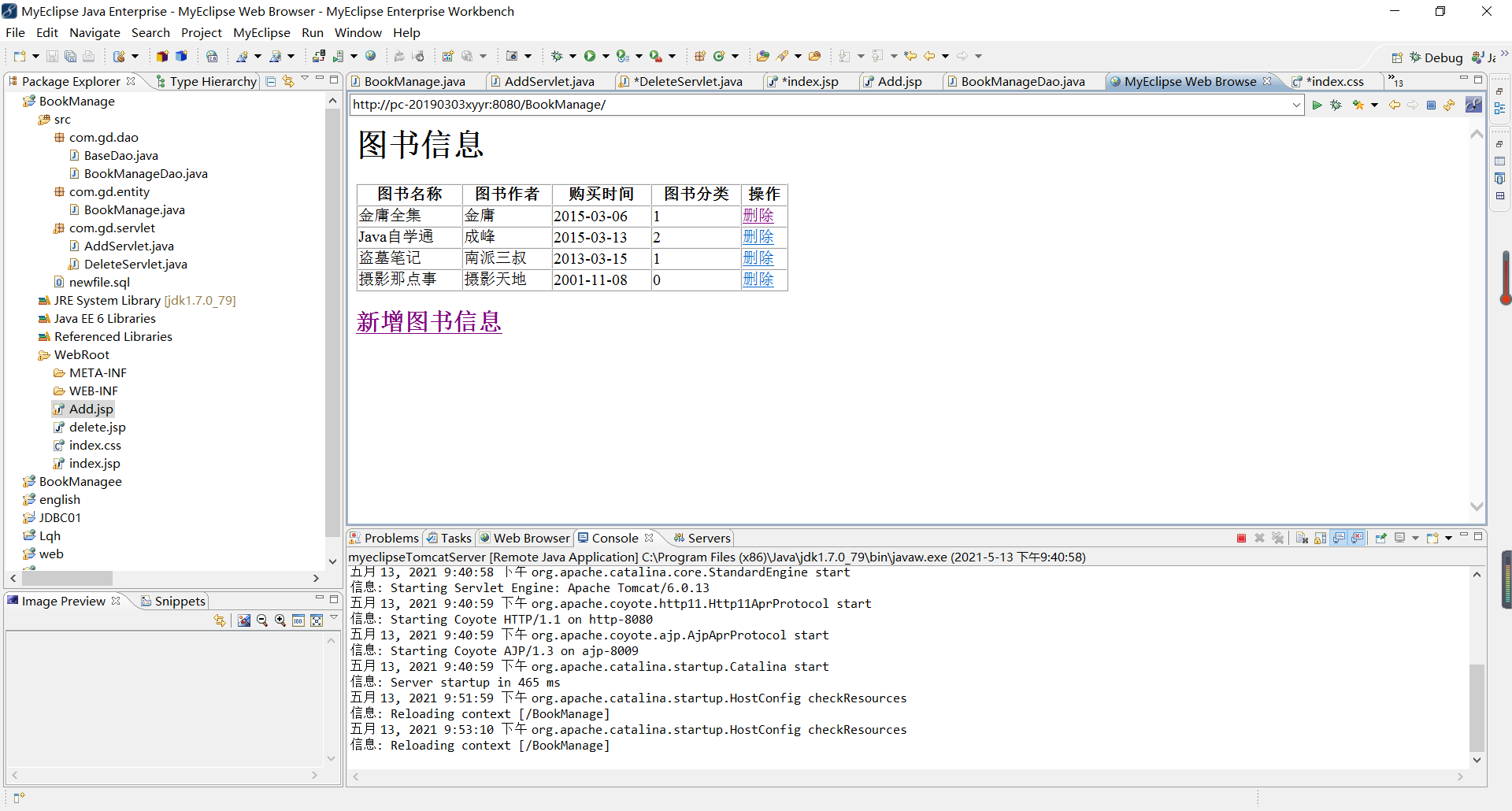 <%@page import="com.gd.entity.BookManage"%> <%@page import="com.gd.dao.BookManageDao"%> <%@ page language="java" import="java.util.*" pageEncoding="utf-8"%> <% String path = request.getContextPath(); String basePath = request.getScheme()+"://"+request.getServerName()+":"+request.getServerPort()+path+"/"; %> <!DOCTYPE HTML PUBLIC "-//W3C//DTD HTML 4.01 Transitional//EN"> <html> <head> <meta charset="UTF-8"> <title>图书管理系统</title> <link rel="stylesheet" type="text/css" href="index.css"/> </head> <body> <h1 >图书信息</h1> <table cellspacing="0" border="1px" width="549" height="66" > <tr> <th>图书名称</th> <th>图书作者</th> <th>购买时间</th> <th>图书分类</th> <th>操作</th> </tr> <% BookManageDao bd = new BookManageDao(); List<BookManage> list = bd.selectall(); for(int i = 0 ;i <list.size();i++){ out.print("<tr>"); out.print("<td>"+list.get(i).getB_name()+"</td>"); out.print("<td>"+list.get(i).getB_author()+"</td>"); out.print("<td>"+list.get(i).getB_time()+"</td>"); out.print("<td>"+list.get(i).getB_type()+"</td>"); %> <td><a href="delete.jsp?b_id=<%=list.get(i).getB_id()%>">删除</a></td> <% out.print("</tr>"); } %> </table> <h2><a href="Add.jsp">新增图书信息</a></h2> </body> </html>