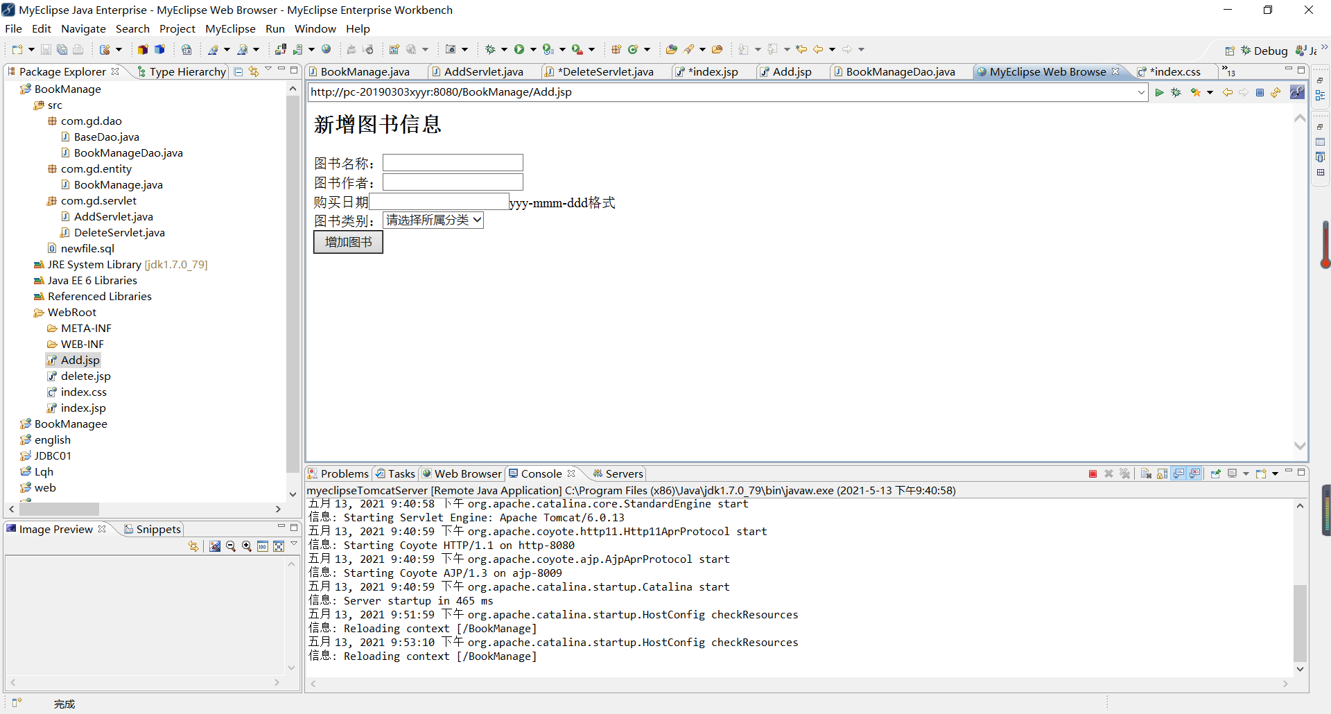 <%@ page language="java" import="java.util.*" pageEncoding="utf-8"%> <% String path = request.getContextPath(); String basePath = request.getScheme()+"://"+request.getServerName()+":"+request.getServerPort()+path+"/"; %> <!DOCTYPE HTML PUBLIC "-//W3C//DTD HTML 4.01 Transitional//EN"> <html> <body> <form action="Add.jsp"> <h2>新增图书信息</h2> 图书名称:<input type="text" name = "b_name"> </br> 图书作者:<input type="text" name = "b_author"> </br> 购买日期<input type="text" name = "b_time">yyy-mmm-ddd格式 </br> 图书类别:<select name="b_type"> <option value="0">请选择所属分类</option> <option value="1">计算机/软件</option> <option value="2">小说/文摘</option> <option value="3">杂项</option> </select> </br> <input type="submit" value="增加图书"> </form> </body> </html>